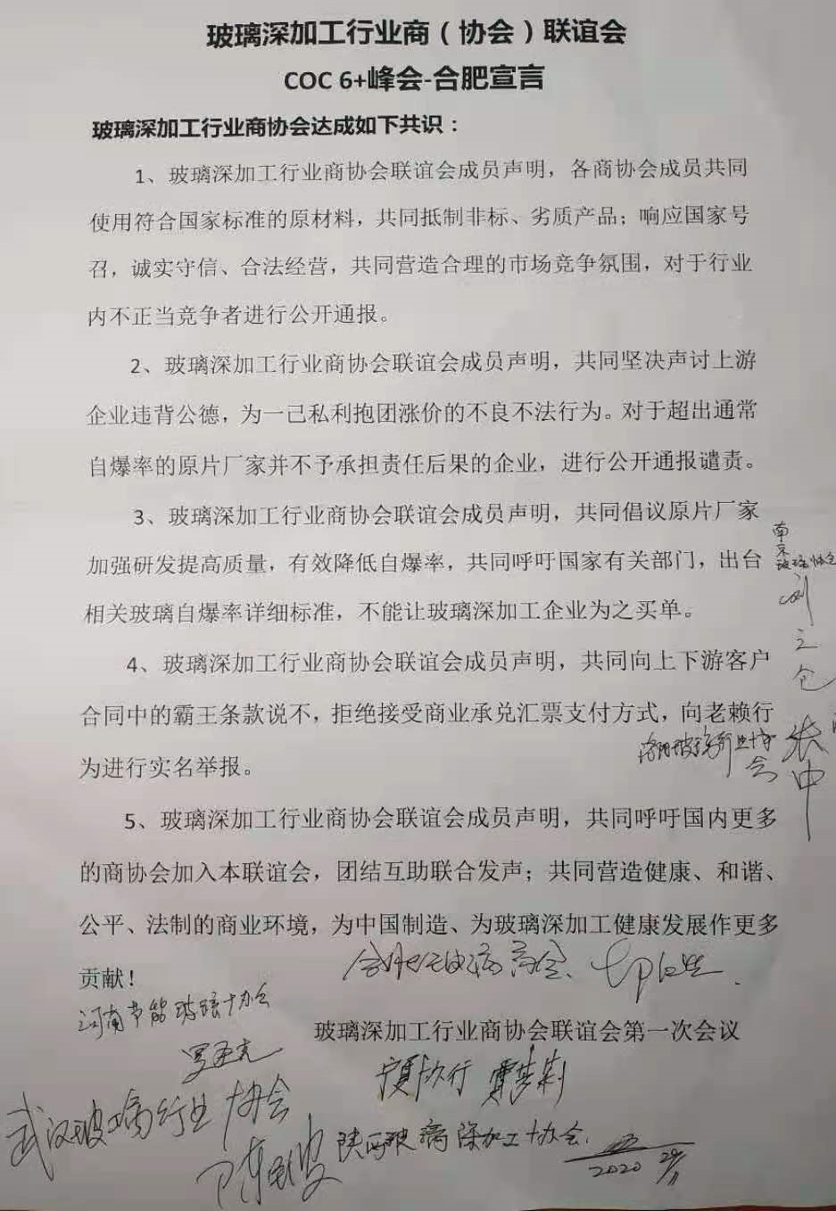 2、玻璃深加工行业商协会联谊会成员声明,共同坚决声讨上游企业违背公德,为一己私利抱团涨价的不良不法行为。对于超出通常自爆率的原片厂家并不予承担责任后果的企业,进行公开通报谴责。
